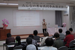三原市では、平成23年10月から男女共同参画推進条例が施行されました。写真は、施行に先立って6月に企画・開催した男女共同参画講演会の様子です。講師は、前千葉県知事の堂本暁子さんです。