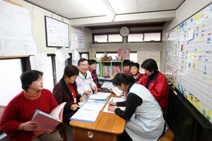 医師・スタッフ一堂に会して、カンファレンスを行っている様子です。高齢者の方、お一人おひとりに合わせたキメの細かい支援に心がけています。
