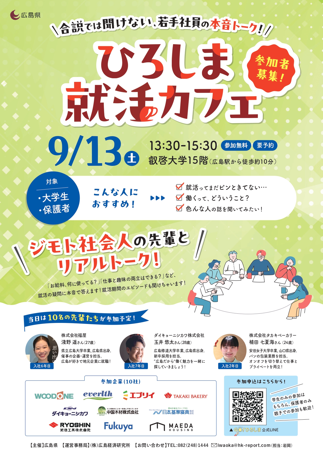広島の企業で活躍する若手社員10名(+人事担当者)から、就活の体験談を聞いたり、就活の悩みを相談をすることができるイベントです。