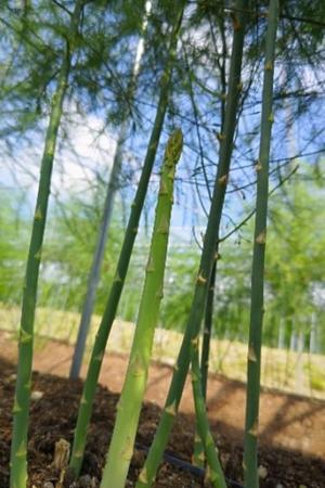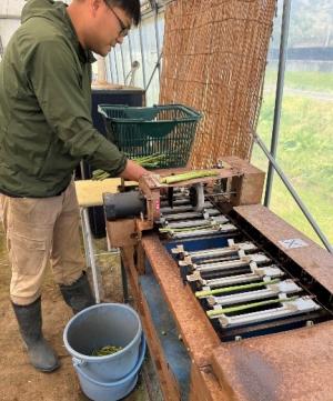 【生育中のアスパラガス】 【出荷調整作業に励む部会員】
