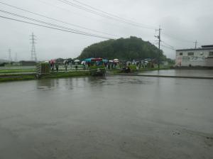 この実演会では、農地の集積が進む同集落法人の実際の活用場面を想定して、隣接する2ほ場で、作業人員2人の無人ロボット田植機と、同3人の慣行の有人田植機の同時作業を行い、作業人員削減の可能性を検証しました。