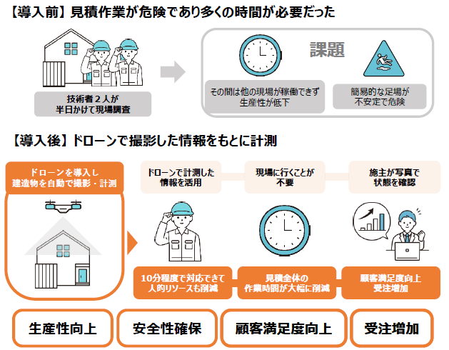 ドローンで撮影した写真を活用することで、見積時や施工後の屋根の状態を施主に見せることができるようになり、顧客満足度が向上し、受注増加につながった。