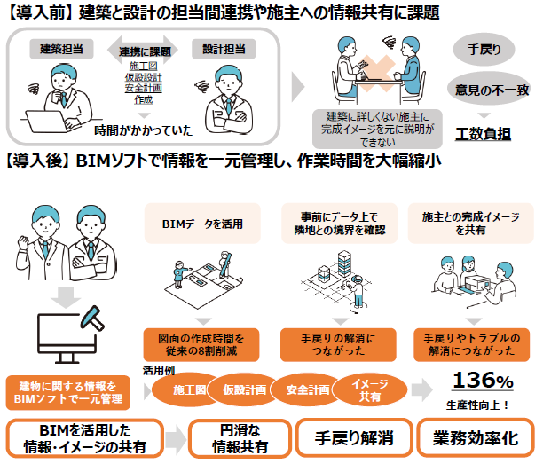 BIM導入で、作業時間の短縮や情報共有の効率化を図り、生産性136%向上!(建築・設計業務)
