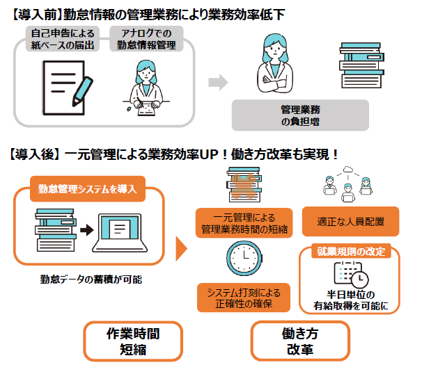 クラウド型の勤怠管理システムを導入し、勤怠情報と休暇情報を一元管理できるようにした。
