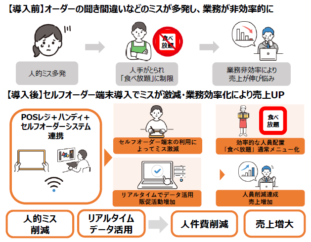 顧客自身が注文できるセルフオーダー端末を導入した。さらに、セルフオーダー端末とスタッフが使用するハンディ端末、レジを連動させることによって、オーダーから会計までの一連の業務を効率化した。