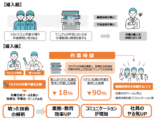 動画による作業解析ソフトを導入し、熟練社員(経験5年目)と新人(経験4か月)それぞれの作業手順や方法を撮影・解析した。
