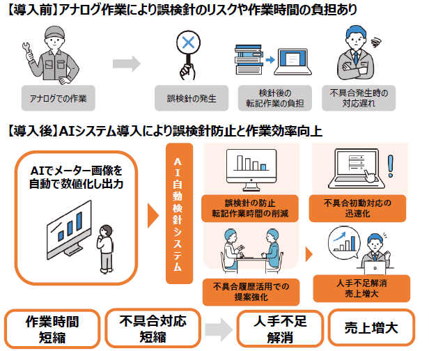 導入したデジタルサービスでは、メーターをカメラで撮影し、画像認識AIで検針データを読み取りクラウドにアップロードできるため、正確かつ効率的なデータ管理ができるようになりました。さらに、異常な数値が検知されるとアラートが通知される機能があり、不具合への迅速な対応が可能となりました。