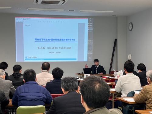 国土交通省中国地方整備局用地部用地企画課の上田課長補佐から「所有者不明土地対策のすすめ」と題して、増加する所有者不明土地に対する法令改正や支援制度、対策の流れなどについて、ご説明いただきました。