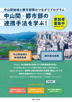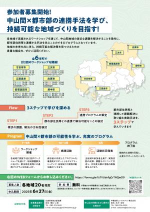 本事業は、中山間地域の地域づくり活動実践者を対象に、中山間地域の暮らしや文化活動等の維持に関連した課題の解決に継続的に取り組みたい地域外の都市部住民や企業等(関係人口)との連携手法等を学ぶワークショップを開催し、双方がつながり支え合うことで持続可能な地域づくりを目指すプログラムです。