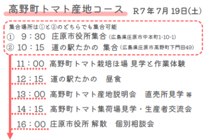 トマト集出荷場見学、栽培ほ場見学、収穫体験会、産地生産者との交流を予定。