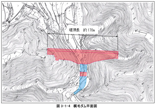 梶毛ダムの諸元及び計画高水流量配分図,梶毛ダム湛水区域図等を次に示します。